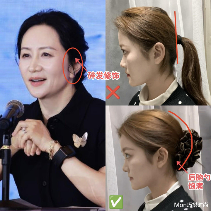 不喜欢披发的姐妹也可以像孟晚舟这样把头发扎起来,但是最好别选高马尾或高丸子头,不仅勒头皮还和年龄不搭。
