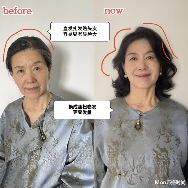 比如这位阿姨她的面部轮廓崎岖不平,原本贴头皮的扎发就很暴露缺陷,后面换的蓬松短发弧度柔和,就能扬长避短。看来我们想显年轻,光换发型还不够,更重要的是选择一款最适合自己的发型~