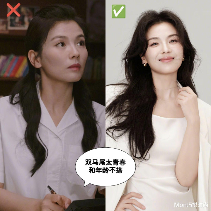 很多人都对发型有误区,觉得只要发型够少女,自己就能跟着变年轻,简直大错特错!像双马尾这类少女感很强的发型放到大龄女性头上真的很违和,反而更容易让人关注到你的皱纹、木偶纹。
