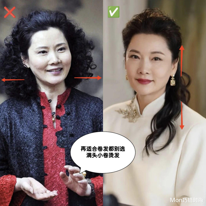 在选发型这件事上,有“颜”也不能任性啊,不信你看何赛飞,她烫完满头小卷短发后也成了油腻大妈。她的脸型比较柔和,更适合能适当拉长脸型的微卷和纵向大卷,圆脸的姐妹也可以这样选发型。