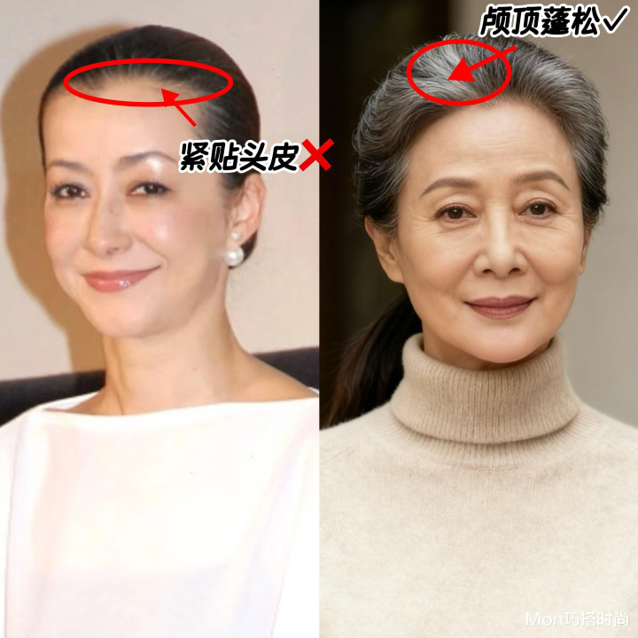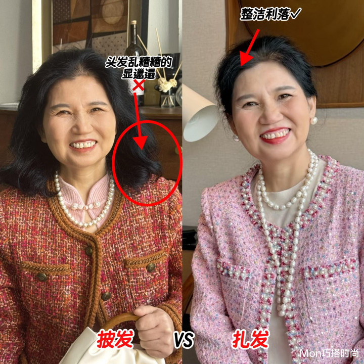 观察了一圈,我发现上年纪的阿姨们在选择发型的时候总是喜欢披着,认为披发修饰脸型还有氛围感,但你不知道的是,扎发可能比披发更适合你哦,如果你还没有尝试过扎发,看看下面三组对比,就知道为什么年纪越大越适合扎发了。