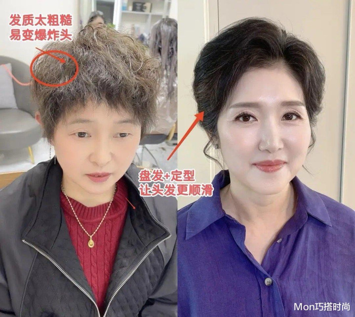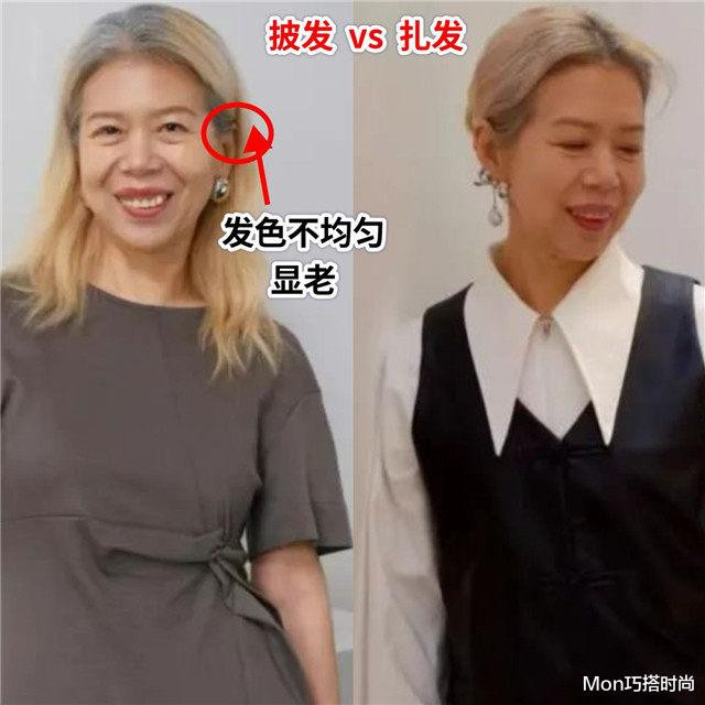 像下面这个阿姨,把头发扎起来脸部的紧致度一下子就提起来了,效果堪比做医美,年轻十岁一点都不夸张。