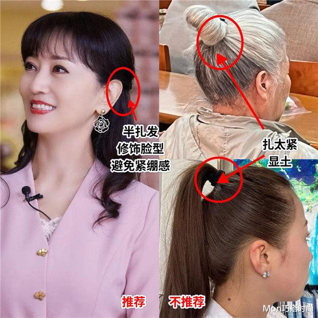 其实发腮的中年女人更适合扎发,因为披发堆在我们的脖子处,反而会把视觉焦点放在我们的脸颊附近,直接暴露缺点,而扎发把重心提起来,降低了腮部附近的堆积感,反而显得脸型线条更清晰和流畅。