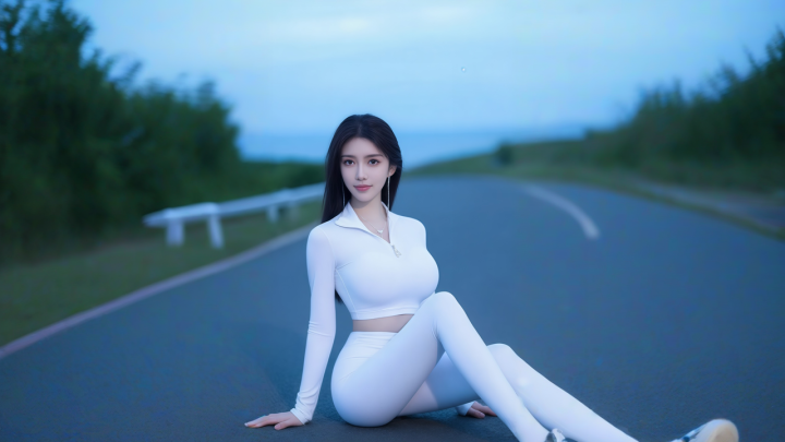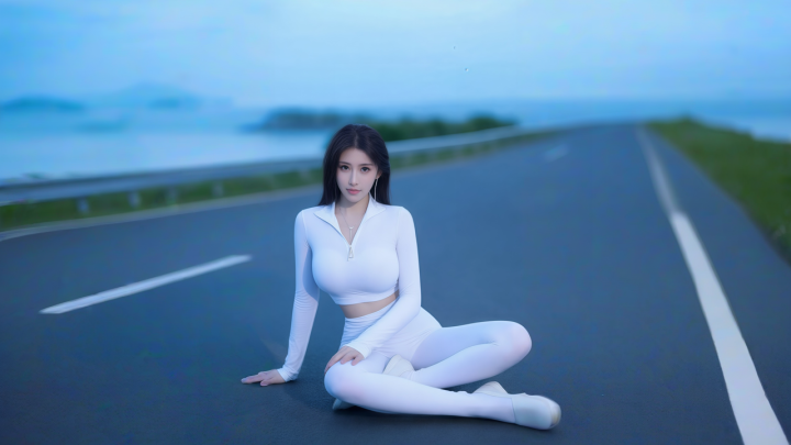 换个姿势坐在路面,她将右腿弯曲,左手随意搭在膝盖上。白色运动套装在阳光下泛着柔和的光泽,长发顺着肩线垂落,发梢似乎还带着海风的气息。公路像一条银灰色的绸带向远方延伸,而她就像画框里恰到好处的落笔,不多一分雕琢,却让整个画面有了呼吸感。