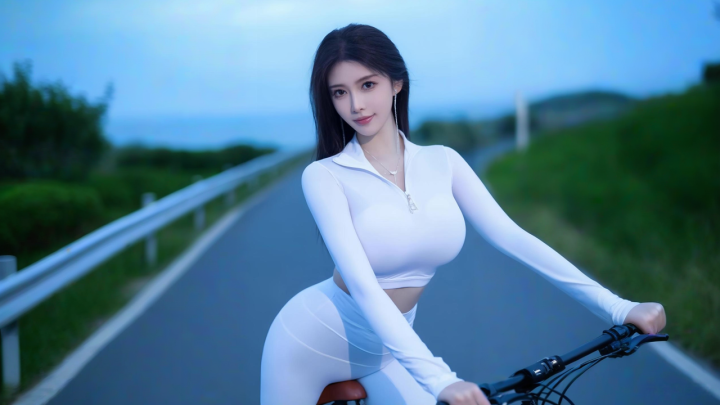 车把上还沾着露水,她微微弓背握住车把,目光望向远方的海平面。骑行裤包裹的腿部肌肉线条流畅,白色外套的拉链随意拉到胸口,露出纤细的锁骨。阳光穿透云层洒在她侧脸,睫毛在眼下投出淡淡阴影,像是在说:比起健身房的跑步机,她更爱车轮与公路摩擦的真实触感。