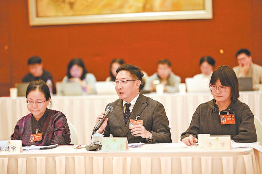 昨天下午,在市政协十四届四次会议举行的“关于提高生活垃圾分类和回收利用水平的提案”办理协商会上,沈腾委员(中)就提案内容进行发言。本报记者甘南摄