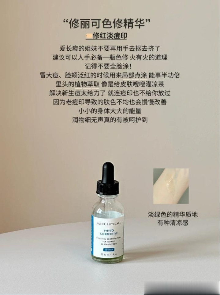主要作用是舒缓修红。色修总得有点真实力才能在修红精华中突出吧,尤其像我这种夏天爱冒红痘,秋冬偶尔也来个,每次起痘都伴着脸蛋子泛红、还是一片片的,但我能几天就好,完全是靠色修的复合植萃配方,橄榄叶提取物+桑根皮提取物就是修红的秘诀。