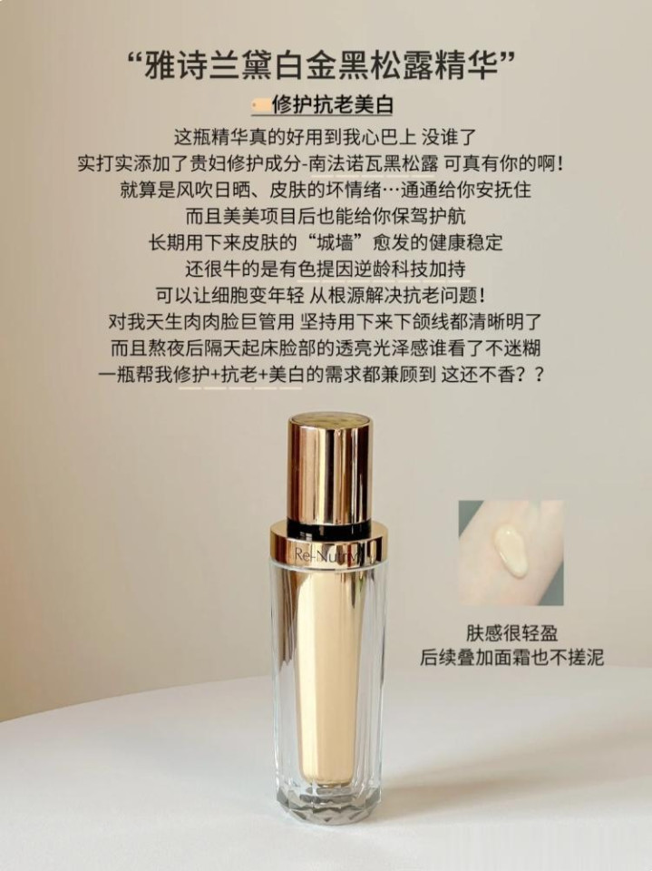 这瓶的性价比真值得夸,不到2k搞定修护+抗老+美白三件大事,堪比钻石的南法诺瓦黑松露,修护力很在线,平时易泛红刺痛的皮肤用后觉得脸皮变厚了,更稳定。加上色提因逆龄科技,皮肤肉眼可见的紧实透亮,质地流动性高,上脸肤感轻盈,这一瓶我觉得没人会不爱。