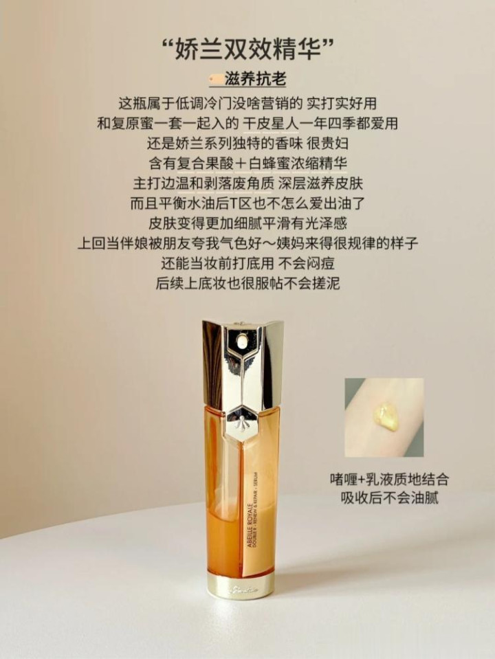 个人觉得这支很适合油皮,我T区出油蛮多的,毛孔粗大,这支精华是通过调理角质,让皮肤更加细腻平滑,一边是啫喱质地,一边是乳液质地,两个混在一起清爽一点不粘腻,干皮建议和复原蜜搭配着用,脸蛋摸起来是滑溜溜的,还带着自然的光泽感。