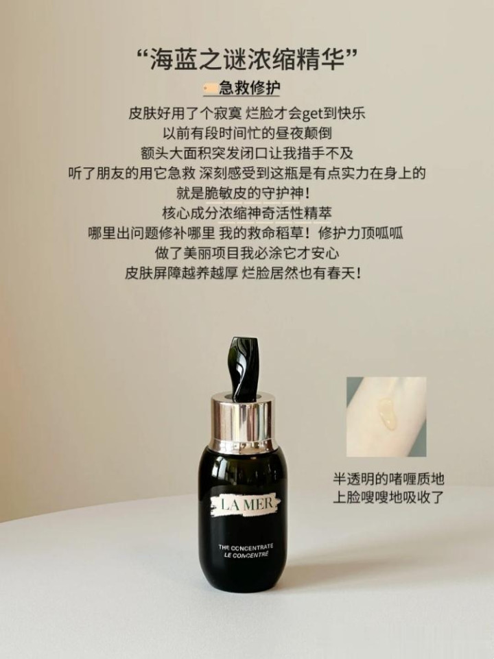核心成分:海蓝之谜浓缩修护精华露凝聚了品牌的核心成分——神奇活性精粹,这种独特的成分是通过三天三夜在低温真空环境中精心萃炼而成的,具有强大的修护和再生能力。