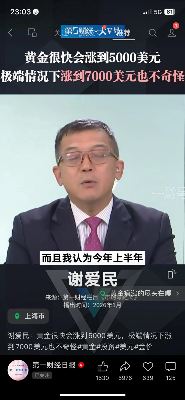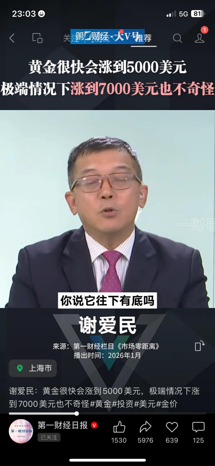 2026年财经圈首个重磅风口来袭,黄金市场行情彻底迎来大爆发!闪金资管基金经理谢爱民在第一财经《市场零距离》节目中明确表示,黄金很快会涨到5000美元/盎司,极端市场环境下甚至冲击7000美元关口,这波涨幅力度,比往年任何一次黄金行情都要猛,对于普通人来说,不用大额资金投入,低门槛也能跟上这波黄金行情的红利!