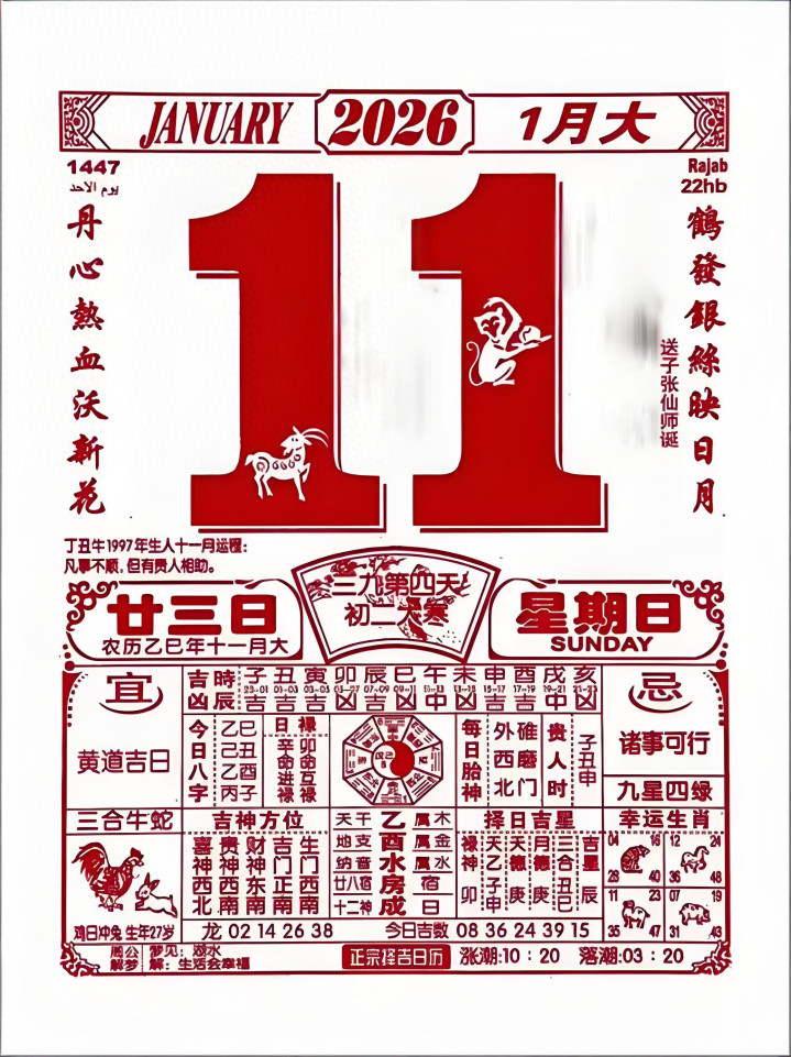 黄历心中过,遇事不出错。1月11日,星期日,农历十一月二十三,大家可以先留下一句:百无禁忌。祝福一下自己。这天值神是勾陈,象征着权威、威严、稳定与秩序,同时也代表着挑战与机遇。这天是成日,适合完成目标、举办仪式、签订契约,预示着各种事物都能取得圆满的结果。穿衣颜色推荐蓝色、黑色、灰色系。不推荐 绿色、青色、翠绿色系。打麻将求职找工作的可以去东北边,约会谈恋爱的可以约在家西北边。生肖注意事项,小鼠心情低落,开云小牛充满活力,小虎杂事较多,小兔起伏不定,小龙鸿运当头,小蛇心情大好,小马沉着冷静,小羊积极面对,小猴财运攀高,小鸡关系下降,小狗劳而无功,小猪精神饱满,有缘刷到,祝你开心,福生无量。